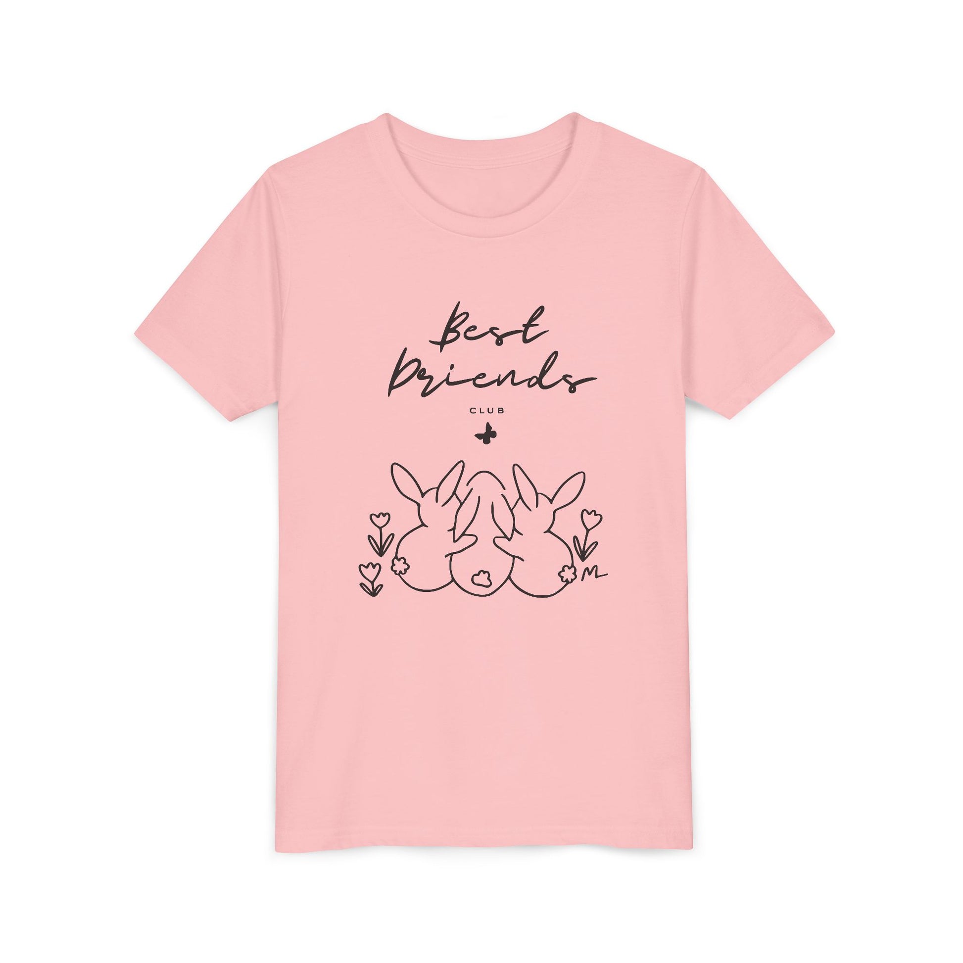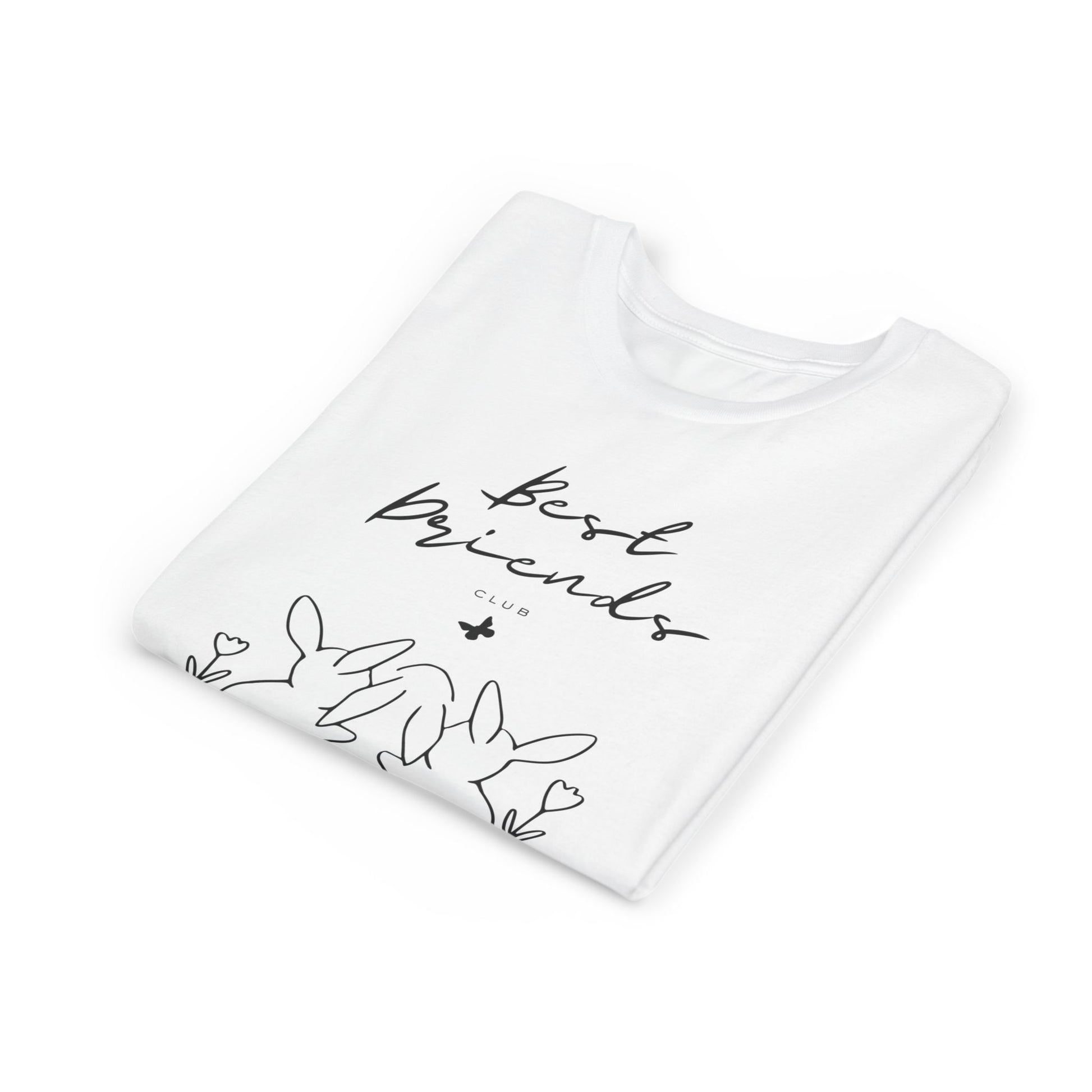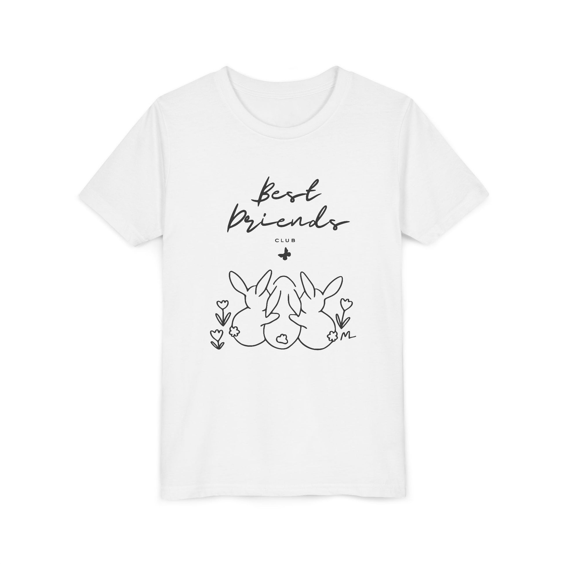 Soft, simple, and full of quiet charm — this youth tee wears like a hug. A delicate line-art print of three bunnies sharing a secret under the handwritten words “best friends” sits centered on the chest. The lightweight, airlume-combed cotton feels cloud-soft against young skin, while the retail fit and crew neckline keep the silhouette modern and easy to layer. It reads like a sketch from a shared notebook: gentle, honest, and meant to be worn to the playground, sleepovers, or while making memories with a closest friend.